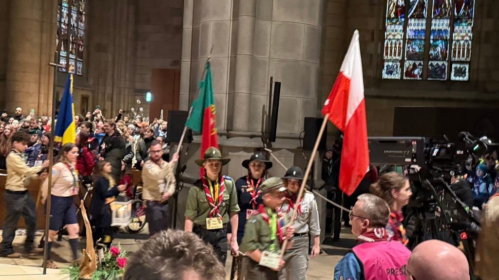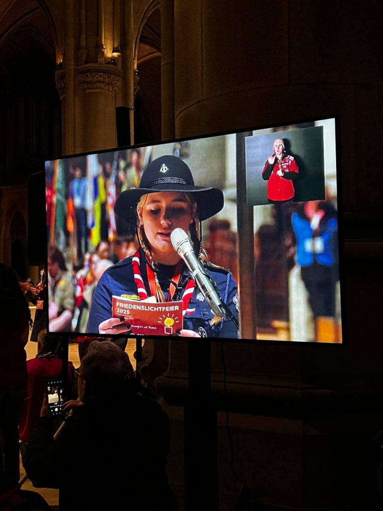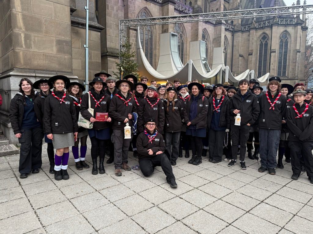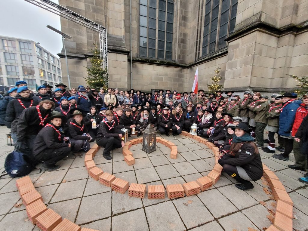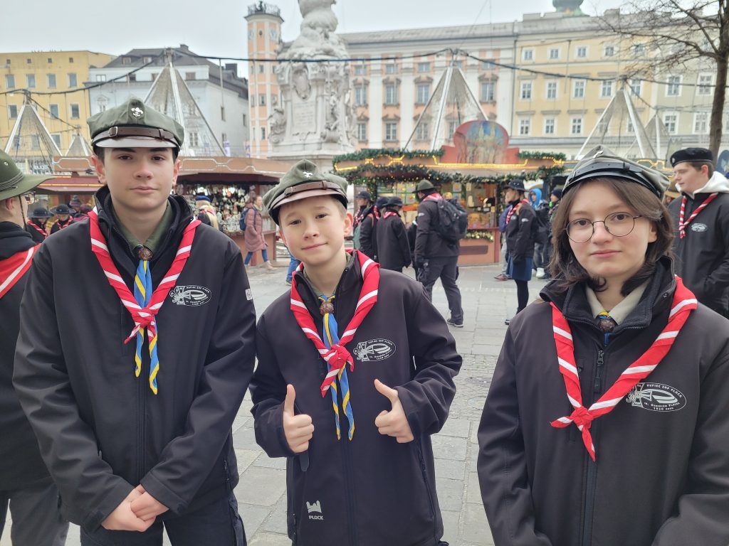 Następnie przyszedł czas na Uroczystość Przekazania Betlejemskiego Światła Pokoju w Mariendom. Nasz hufiec był częścią Reprezentacji ZHP na tym wydarzeniu, a jedna z naszych drużynowych — sam. Alicja Molak (drużynowa 15 PWDW „Keja”) — znalazła się w trzyosobowej delegacji odbierającej Światło z rąk austriackich skautów! ⚜️🕯🪢