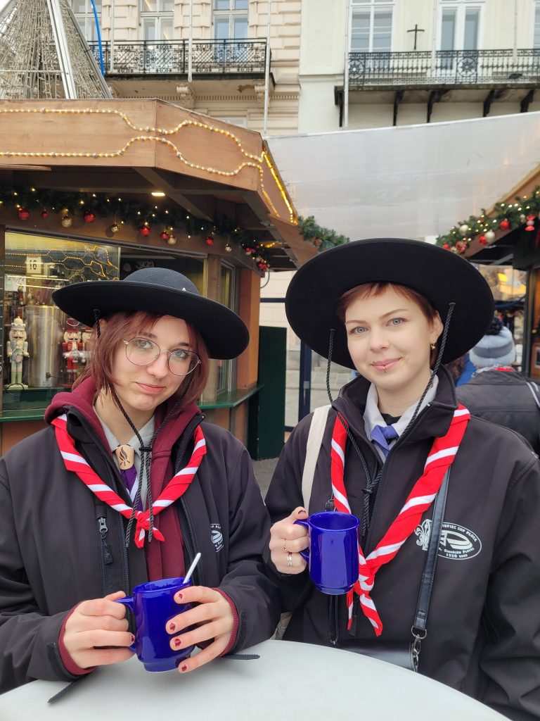 Po uroczystości nie zabrakło rozmów z innymi skautami oraz wymiany chust — tradycji obecnej na każdym wydarzeniu skautowym! Kolejnym przystankiem było praskie centrum, w którym odwiedziliśmy takie miejsca jak Lennon Wall, Rynek Staromiejski oraz świąteczny jarmark. 🔥